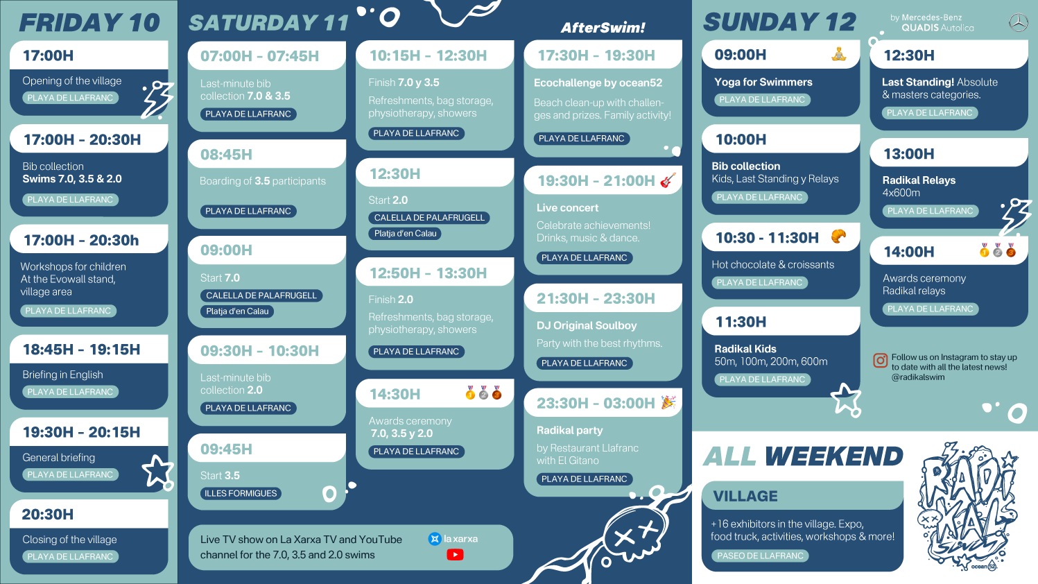 On Sunday 12 it will be also celebrated the Radikal Relays: in teams of 4 members, each swimmer will complete 600m inside the bay of Llafranc. Only available for registered swimmers at 2.0, 3.5 and 7.0 open water swims! - Registration here
